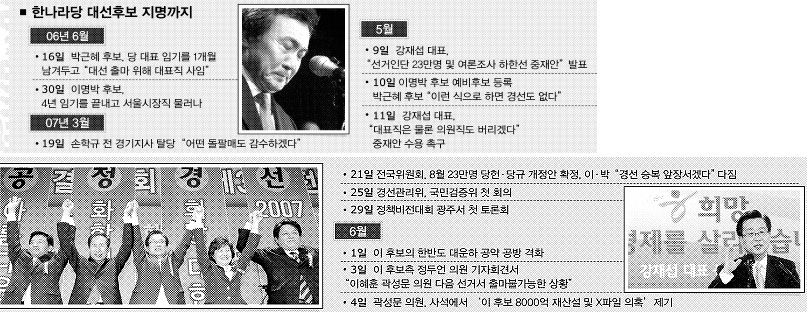한나라당 이명박·박근혜 대선 경선 후보간 공방은 투표일인 19일에도 계속됐다. 이·박 후보 진영은 이날 기표소에서 들린 카메라폰 셔터 소리를 놓고 대립했다. 부산 부산진구에서 40대 여성이, 인천 남동구에서 50대 남성이, 울산 남구에서 40대 여성이, 대구 달성군에서 40대 남성이 투표 뒤 기표용지를 촬영하다가 중앙선거관리위원회에 적발됐다.