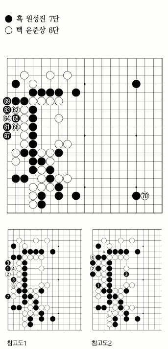 흑으로서는 비상시국이 아닐 수 없다. 만일 흑이 패에서 지는 날에는 백을 살려주는 것뿐만 아니라 거대한 중앙 흑 대마까지 잡히기 때문이다. 수순 중 흑67로 뻗은 것이 그나마 흑의 목숨을 연장한 호착. 당장 <참고도2> 흑1로 단수쳐 패를 결행하는 것은 그 다음 결정적인 팻감이 보이지 않는다. 흑으로서는 3으로 붙여 탈출을 시도하는 정도인데 백이 뒤돌아보지 않고 4로 때려내면 여전히 A로 흑 두점이 잡히는 맛이 남아 흑이 더 이상 버티기 힘들다. 반면 백도 패를 서두르지 않고 백70으로 팻감공작을 한 것은 아마추어들이 배워둘 만한 수법. 이 장면에서 흑이 패를 해소하려 한다면 다시 두 수를 들여야 하는데 그러면 백은 결과적으로 혼자서 세 수를 두는 셈이 된다. 원성진 7단으로서는 자청해서 가시밭길로 걸어 들어가고 있는 심정이다.(백68…64의 곳)