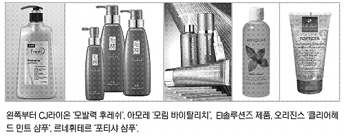 가늘고 약한 모발을 겨냥한 레드켄의 비바젠(300㎖,2만 6000원), 민트 성분이 들어 있어 청정효과가 있다고 강조하는 오리진스의 클리어헤드 민트 샴푸(250㎖,1만 5000원), 세포재생을 촉진하는 식물성 펩타이드가 함유된 르네휘테르의 포티샤 샴푸(150㎖,3만원), 세정효과로 비듬에도 효과적인 것으로 알려진 아베다의 로즈메리 민트샴푸(250㎖,1만 7000원), 두피 진정을 위한 카모마일 성분이 들어있는 라우쉬의 카모마일 샴푸(200㎖,2만 7000원), 로즈마리 에센셜 오일이 들어 있는 시슬리의 샹뿌잉 휘또-아로마띠크(200㎖,7만원) 등이 있다.