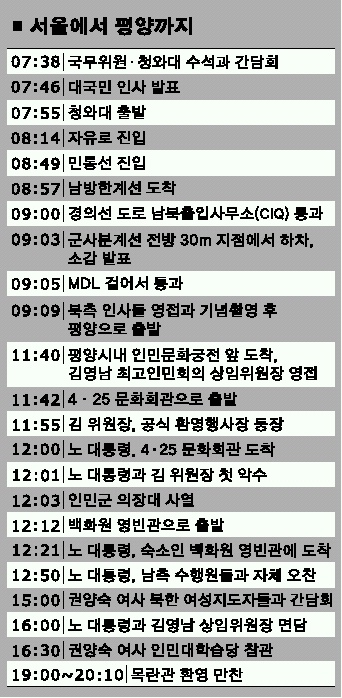 사상 처음으로 남한 대통령이 군사분계선을 한 걸음으로 훌쩍 넘었다. 평양까지 승용차로 3시간이 채 안 걸렸다. 반세기 넘게 대치해온 남과 북은 지척에 있었던 것이다.2일 평양 시내 한복판에서 노무현 대통령과 김정일 북한 국방위원장이 굳게 맞잡은 손엔 7000만 겨레의 통일 염원이 응축돼 있었다.