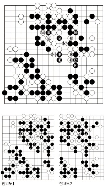 그렇다고 흑이 <참고도1> 흑3으로 때려내지 않고 <참고도2> 흑1로 백 두점을 잡으면, 백이 4로 빠져나오는 수가 성립해 흑이 더욱 곤란해진다. 이런 연유로 흑은 실전 149로 후퇴한 것이다. 백150은 흑의 단점을 노리기 위해 일단 이어놓고 볼 자리. 그러나 흑151이 백의 심장을 향해 던진 비수와도 같다.