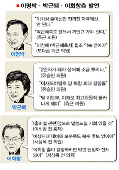 한나라당이 시끄럽다. 대통합신당이 정동영 후보 선출 이후 당내 갈등을 잠재우고 한목소리를 내는 것과 상반된다. 분열과 갈등의 모습이 노출되고, 서로를 불신하는 목소리가 터져나온다. 이명박 후보측은 박근혜 전 대표측과의 화합을 이끌어내지 못하고, 이회창 전 총재의 출마설로 내홍을 맞고 있다.3인은 측근들을 통해 의중을 간접적으로 드러낼 뿐 직접 언급을 자제한다. 반면 복심(腹心)이나 주변 인사들이 서로를 향해 쏟아내는 말들은 훨씬 격정적이고 공격적이다. 끝내 어느 한쪽이라도 다른 행보를 보인다면 이 후보 대선 가도에는 치명타가 될 것이 분명하다.
