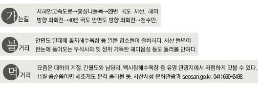 천수만과 간월도 일원에서 25일까지 ‘2007 서산천수만 세계 철새기행전´이 개최된다. 행사 기간 중 천수만 A,B 지구의 차량출입이 통제된다.seosanbird.com, 천수만철새기행전위원회 사무국 041)669-7744. 부석사에서는 철새 탐조와 템플스테이를 연계한 프로그램을 운영하고 있다.busuksa.com,041)662-3824.