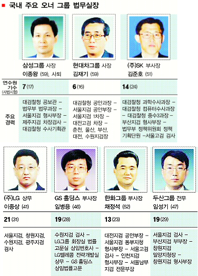 지난 10일 사퇴한 이종왕 전 법무실장은 대검찰청 수사기획관과 김앤장 변호사 출신이다. 김재기 고문은 수원지검장, 김준호 부사장은 대검 중수부과장을 역임했다. 채정석 부사장과 임성기 전무는 부장검사 출신이다. 이종상 상무와 임병용 부사장은 평검사 출신이다. 임 부사장은 검찰에서 1년간 보낸 뒤 럭키금성그룹(전 LG그룹)회장실과 사업부서에서도 근무했었다. 삼성그룹 김용철 전 법무팀장도 특수부 검사였다. 국정원 불법감청과 법조비리 사건 수사를 주도했던 박민식 전 검사는 지난해 변호사로 나설 때 한 대기업으로부터 영입제의를 받았지만 거절했다고 한다.