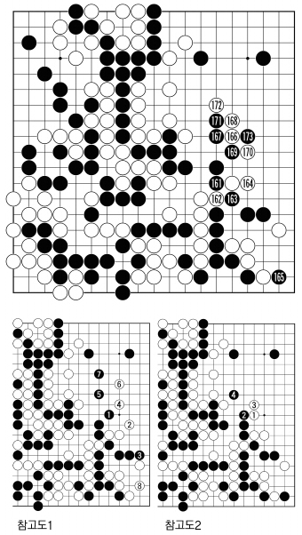 흑161,163으로 나와 끊은 것은 내친걸음. 어찌되었건 이곳을 두지 않으면 바둑이 되지 않는다. 흑165는 <참고도1> 흑1로 씌우는 것이 제일감이지만 이때는 백2의 마늘모가 탄력적인 응수로 역시 흑이 곤란하다. 흑은 백의 연결을 차단하기 위해 3의 곳을 막아야하지만, 백이 4,6 등을 선수한 뒤 다시 백8로 귀를 보강하면, 우하귀 흑대마는 두 눈을 만들기 힘들어진다.