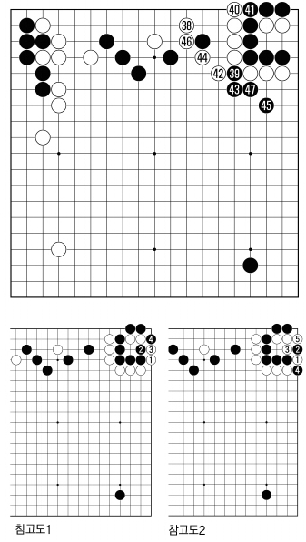백38은 백40으로 내려서는 수가 항상 선수로 듣기 때문에 가능한 침입. 여기에 마땅한 대응수단이 보이지 않는 흑도 39로 끊어 변화를 구하고 있다. 흑47까지는 상전벽해와 같은 바꿔치기. 흑은 자연스럽게 귀의 패맛을 없애며 백 석점을 잡았지만, 대신 상변 흑진이 초토화되었다. 이제는 백이 상변 흑에 대한 공격에 나설 차례이다.
