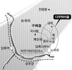 섬진강 물줄기에 힘을 싣는 곳은 전남 곡성군 오곡면 압록리인데 그 길을 가만히 거스르면 보성 일림산 용추폭포까지 가 닿는다.126㎞를 내달린 보성강은 ‘섬진강 제1지류’의 의무를 다한 채 압록에서 삶을 마감하고 보성강이란 이름표를 떼어 놓는다. 풍만한 기운이 2.5㎞쯤 더 흐르다 머뭇머뭇 멈춘 곳이 유곡나루, 다무락마을은 이 유곡나루와 구례 천왕봉(695m) 사이에 오붓하게 앉았다.