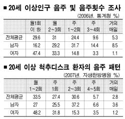 척추전문 병원으로 유명한 서울 자생한방병원은 최근 척추질환으로 내원한 20세 이상 남녀 환자 403명을 대상으로 습관적 음주 여부를 조사한 결과 69.7%가 술을 마신다고 했다. 지난해 통계청 발표에 따르면 우리 성인 남녀를 포함해 주 1회 이상 음주를 하는 비율은 39.4%로 나타난 것과 비교된다. 지난 1년 동안 이 병원에 내원한 허리 디스크 환자 가운데 주 1회 이상 술을 마시는 여성은 51.8%, 남성은 72.9%에 이르렀다.