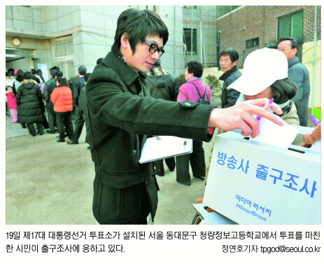 KBS·MBC·SBS 등 3개 지상파 방송사가 19일 실시한 출구조사는 한나라당 이명박 당선자의 당선을 정확히 예측했다. 이 당선자는 이 방송사들의 조사에서 모두 대통합 민주신당 정동영 후보를 20% 포인트 이상의 큰 격차로 누르며 과반의 득표율을 보였다.