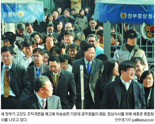 현재 국가공무원 60만 4000여명 가운데 교원·경찰·교정·소방·집배원 등을 제외할 경우 55개 중앙행정기관 소속 공무원 수는 9만 7300여명이다. 또 이들 인력의 30% 가량은 기관별로 차이가 거의 없는 인사·서무 등 공통업무 부서에 몸담고 있다.