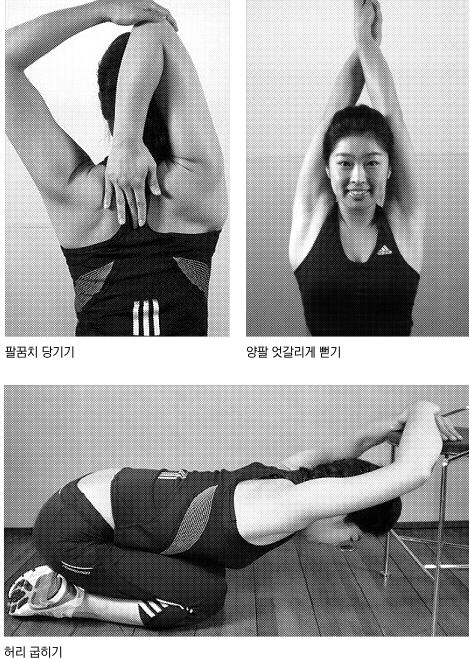 양팔 엇갈리게 잡은 뒤 머리뒤로 젖혀야