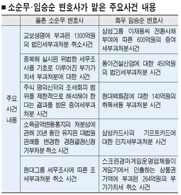 사건성격으로 볼 때 임 변호사가 대형 사건을 맡았다면 소 변호사는 법리적으로 법조계에 영향을 끼친 사건들을 대리해 왔다.