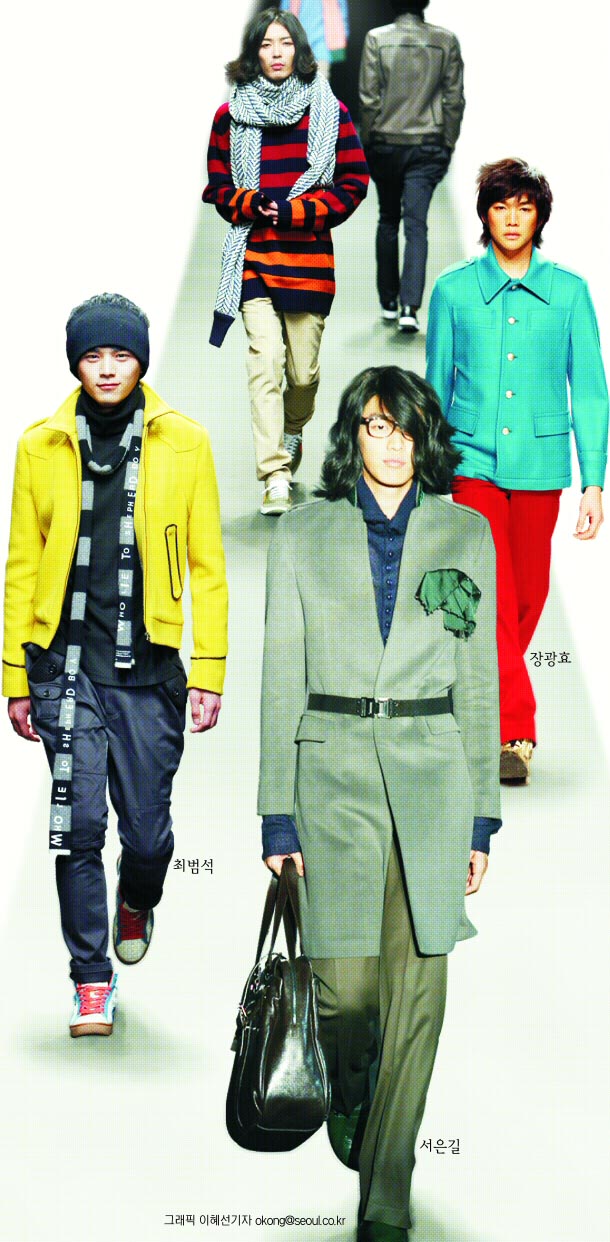오프닝 무대를 장식한 디자이너 장광효의 작품도 ‘고운 남자들’을 위한 것이었다. 민트 색상의 캐주얼 정장, 청록색 상의와 자주색 바지 등은 남자들에게 한없이 발랄해지라고 속삭이는 듯하다. 젊은 층에게 열광적인 지지를 받는 디자이너 최범석의 쇼를 채운 것도 가냘프고 귀여운 소년들이다.
