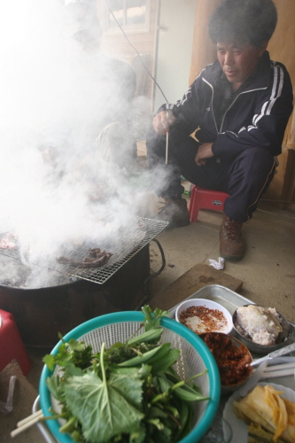 커다란 무쇠솥이 두 개, 고기도 구워 먹고 화로로 쓰는 널찍한 양철통이 한편에 놓여 있고, 산물을 끌어다 쓰기 때문에 수도꼭지는 잠그지 않은 채로 졸졸 물이 흘러내린다. 무쇠솥에 물을 한 가득 넣고 군불을 지핀다. 자그마한 풍무를 돌려가면서. 가스레인지 위에는 구수한 된장국이 부글부글 끓는다. 하루 종일 나물 뜯느라 지친 몸을 얼레지 된장국에 찬밥을 넣고 김치 한 가지로 때우는 것이다.