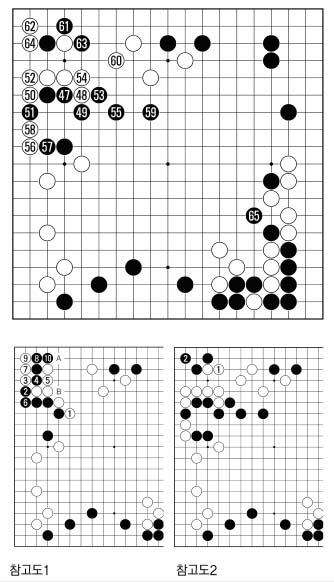 백50은 기세상 (참고도1) 백1로 이단젖히고 싶은 곳이지만, 흑에게 2,4로 끊기는 맥점을 당하면 이후의 수순에서 보듯 백의 후속수단이 두절된다. 물론 흑이 10으로 꼬부렸을 때 백이 A로 막는 것은 흑B로 끊겨 곤란하다. 백60은 좌상귀 쪽의 뒷맛을 효율적으로 지키려는 의도. 따라서 흑이 61로 응수를 물었을 때 백은 선택의 여지가 없이 무조건 잡는 수단을 강구해야 한다. 백62로 치중한 것이 바로 그것. 나약하게 (참고도2) 백1로 물러서면 흑이 2로 호구쳐 알기 쉽게 산다. 백64까지 일단 흑은 잡혀 있는 모습. 그러나 아직은 약간의 꺼림칙한 뒷맛이 남아있어 백도 항상 신경을 써야 한다. 흑65는 이전부터 숙제로 남겨두었던 곳. 흑은 초반 주도권을 확실하게 잡으려는 듯 이곳저곳에서 발빠르게 움직이고 있다.