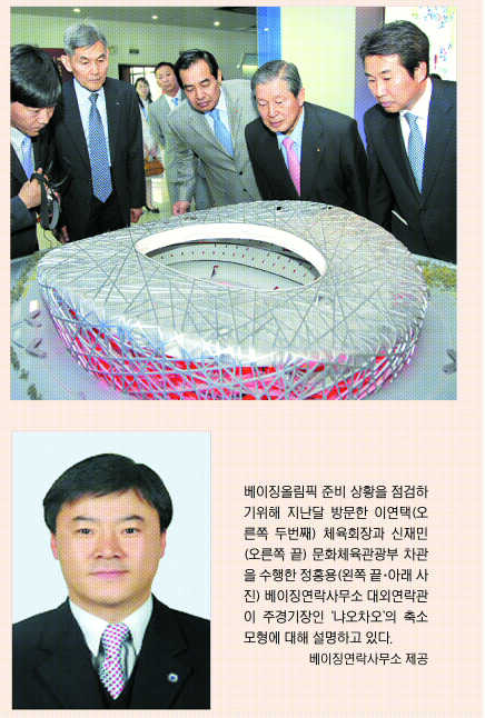 이런 준비가 가능했던 것은 지난해 2월12일 문을 연 대한체육회 베이징올림픽 연락사무소 직원들의 노력 덕분. 이 사무소 소장인 이병권(61) 재중국 대한체육회 회장의 영향력과 80만명이 넘는 회원들의 노력이 열매를 맺었다.