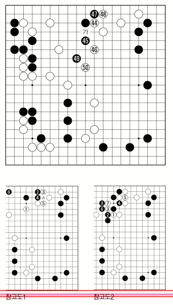 실전과 같이 흑이 상변을 침투한 모양에서 백44의 붙임은 거의 절대에 가깝다. 흔히 아마추어의 바둑에서는 자신의 집을 깨러 들어온 상대가 괘씸해 (참고도1) 백1과 같이 모자를 씌워 흑 전체를 잡으러 가는 시도가 종종 등장한다. 그러나 흑이 2,4를 활용한 뒤 6으로 벌려두면 백이 흑을 잡는 것은 거의 불가능하다. 게다가 백에게는 A로 찝히는 단점마저 남게 된다. 흑45로 가볍게 뛴 것 역시 반드시 알아두어야 할 행마. 호구자리의 급소라고 해서 둔탁하게 가로 뻗는 것은 이후 흑의 발걸음이 너무 무거워진다. 흑49는 언뜻 자신의 단점을 노출시킨 듯하지만, 여기서 백이 (참고도2) 백1,3으로 나와 끊는 것은 흑이 6,8 등으로 쭉쭉 밀어버려 이적행위를 한 꼴이 된다. 백50까지 흑의 외곽 탈출은 일단 봉쇄된 모습. 그러나 흑모양에는 탄력이 넘쳐 두 눈을 만드는 것이 그리 어려워 보이지는 않는다.