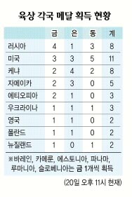중간성적표 金3개 불과 金1개이상 15국 ‘평준화’