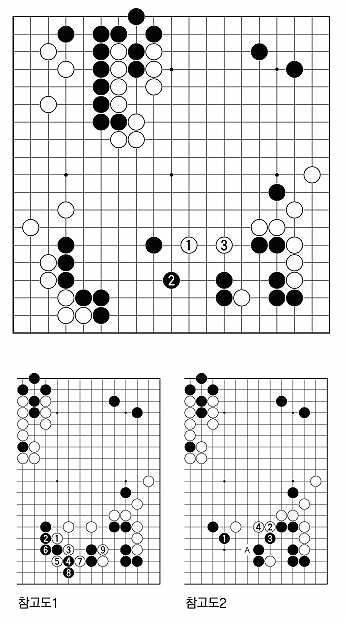 전체적으로 흑의 확정가가 많아 보이는 시점에서 백이 (장면도)백1로 흑진을 삭감한 장면. 흑이 2로 하변을 지킬 때 백3으로 뛴 것이 박영훈 9단 특유의 끈끈함이 묻어 나오는 호착이다. 이후 백이 노리고 있는 것이 (참고도1)의 수단. 백이 1,3 등을 활용한 다음 9로 올라서는 수가 성립되어 흑집이 상당히 줄어들게 된다. 수순을 거슬러 올라가 흑으로서도 (장면도)흑2로 한발 늦추어 받은 것이 최선의 응수. 제일감은 (참고도2)흑1로 지키는 것이지만 이때는 백이 2,4로 두텁게 젖혀 늘은 뒤 A로 붙이는 수가 남게 된다.257수 끝, 백1집반승