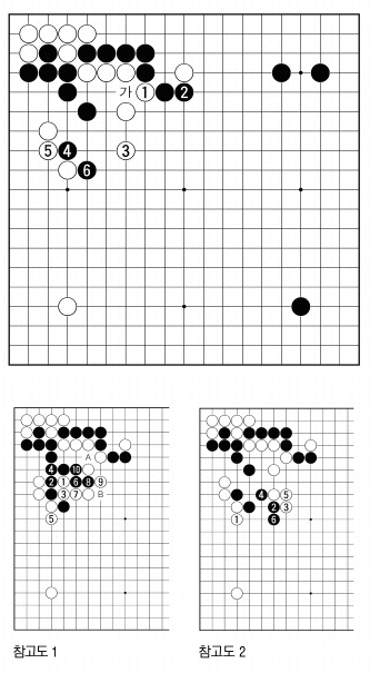 백이 1로 찝은 수는 보통의 경우 금기시되는 행마지만 흑이 ‘가’로 끼우는 수를 선수로 예방하기 위한 고육지책.물론 흑2와 교환되어 상당한 손해지만 백3으로 공격을 하면서 대가를 찾겠다는 전략이다.이때 흑4,6으로 붙이고 젖힌 것이 백의 포위망을 돌파하기 위한 멋들어진 행마.