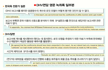 녹취록에 따르면 DHV는 경인운하의 수도권 물동량 분석의 핵심 조사인 국내 수출입 화주들에 대한 운하 이용 선호도 조사(SP·Stated Preference Survey)를 하지 않은 것으로 나타났다. 그런데도 영문 보고서의 부록(Appendix)에는 SP 설문조사를 이행한 것처럼 기록했다. 우리 정부 전문가들의 근거 자료 요구에 DHV측은 “사실상 시간이 부족해 조사하지 못 했다.”고 답변했다. 면담 참석 연구원은 “DHV측이 SP조사를 하지 않았다고 말해 무척 당황스러웠다.”고 말했다. 이 때문에 KDI가 지난달 종료한 경인운하의 재검증 보고서에는 KMI가 과거 한반도 대운하 타당성 연구 과정에서 만든 SP 설문조사 결과를 근거 자료로 삽입하는 등 대운하 연구 내용 일부가 활용된 것으로 드러났다.