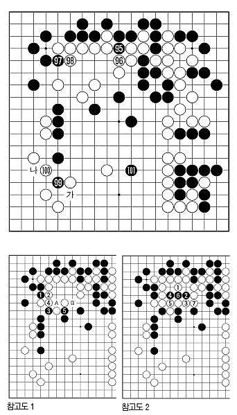 흑99에 백이 ‘가’로 뻗어 응수하면 흑‘나’로 붙여 좌변을 파괴하는 수단이 생기지만, 조한승 9단이 이처럼 간단한 수를 놓칠 리는 만무하다. 따라서 실전 백100은 정수. 흑101은 약간 깊은 듯 보이는 삭감이지만, 이 정도로 백집을 깎지 않는다면 도저히 승부가 불가능하다. 이제부터는 흑의 분발이 필요한 시점이 되었다.