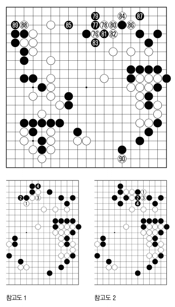 백은 76으로 붙이며 끊임없이 전단을 구하고 있지만, 흑은 묵묵히 77, 79와 같은 견실한 수법으로 일관하고 있다. 백80은 좀처럼 두기 힘든 비상 수단. 평범하게 <참고도1>과 같이 마무리하는 것은 우상귀를 돌아간 흑의 실리가 커서 백이 부담스럽다고 판단한 것이다. 그러나 일단 흑83의 빵때림을 먼저 허용해야 하는 점이 백으로서는 아프다. 백84의 젖힘은 <참고도2> 백1로 껴붙이는 것이 보통 행마의 요령이지만 지금의 배석에서는 흑이 2, 4로 올라서는 수가 있어 백이 곤란하다. 흑85는 백86의 곳으로 뻗어 백의 약점을 노리는 것도 유력한 작전. 그러나 실전에서 흑은 보다 안전한 길을 선택했다. 어쨌든 확실한 집으로만 따지면 흑이 앞서고 있는 상황이라 백도 분발이 필요한 장면인데, 하변에서 백90의 묘한 붙임수를 들고 나와 흑의 응수를 묻고 있다.