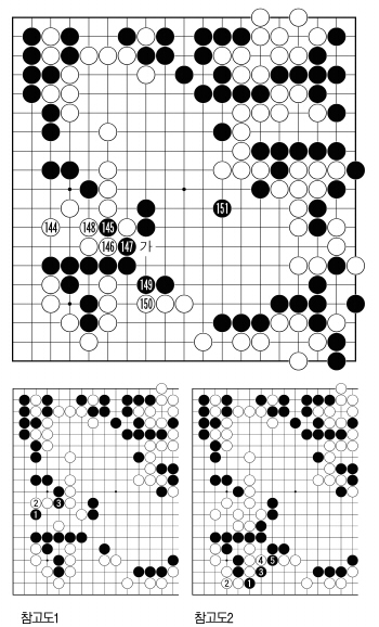 백144는 흑이 <참고도1> 흑1로 두어 연결하는 수단을 방지한 것. 여기서 백이 무리하게 2로 차단하는 것은 흑3으로 돌파하는 수로 백이 안 된다. 또한 백144는 실리로도 클 뿐 아니라 중앙 흑대마에 대한 공격을 은연중에 노리는 일석이조의 효과를 발휘하고 있다. 흑145는 흑 한점을 희생해 백이 ‘가’로 젖혀나오는 뒷맛을 선수로 없애려는 것. 이어 흑149로 뻗는 수까지 선수로 들어 흑의 타개에는 전혀 지장이 없다. 만일 백이 150을 게을리하면, <참고도2> 흑1로 끊은 뒤 흑3, 5의 이단젖힘으로 백진을 돌파하는 맥점이 생긴다. 이제 흑은 중앙 어느 부근을 적당히 벌려두면 타개에는 전혀 지장이 없지만, 실전 흑151은 형세가 만만치 않다고 판단하고 최대한 강하게 버틴 것이다.