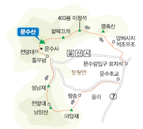 도심 속의 산은 존재만으로 사계절 내내 도시민들에게 청량제 역할을 한다. 봄이면 온갖 꽃으로, 여름에는 짙은 녹음으로, 가을에는 붉디붉은 단풍으로 도시민들의 정서를 풍성하게 해준다. 겨울에는 능선비탈에 하얗게 드리운 잔설로 삭막한 도시에 아름다움을 전한다. 울산시민들에게는 그렇게 활력소 역할을 하며 일상으로 자리잡은 떼려야 뗄 수 없는 산인 문수산이 있다. 울산 울주군 청량면에 자리한 문수산(해발 599.8m). 문수산은 시민들에게 삶의 활력을 불어 넣어 주는 ‘도심의 허파’로 불린다. 동쪽으로 영취산(해발 340m)과 남쪽으로 남암산(해발 543m)을 품고 있다. 울산의 젖줄 태화강은 문수산 북쪽을 돌아 동해로 흘러간다. 문수산은 전국 각지에서 모여든 울산사람들의 취향만큼이나 다양한 길이 있다. 다리가 불편하거나 체력이 달리는 사람들은 율리 안영축에서 일명 ‘깔딱고개’ 코스를 선택한다. 체력에 자신이 있거나 자신의 한계를 시험해 보고 싶은 이는 울산양육원을 출발해 정상에 오른다.