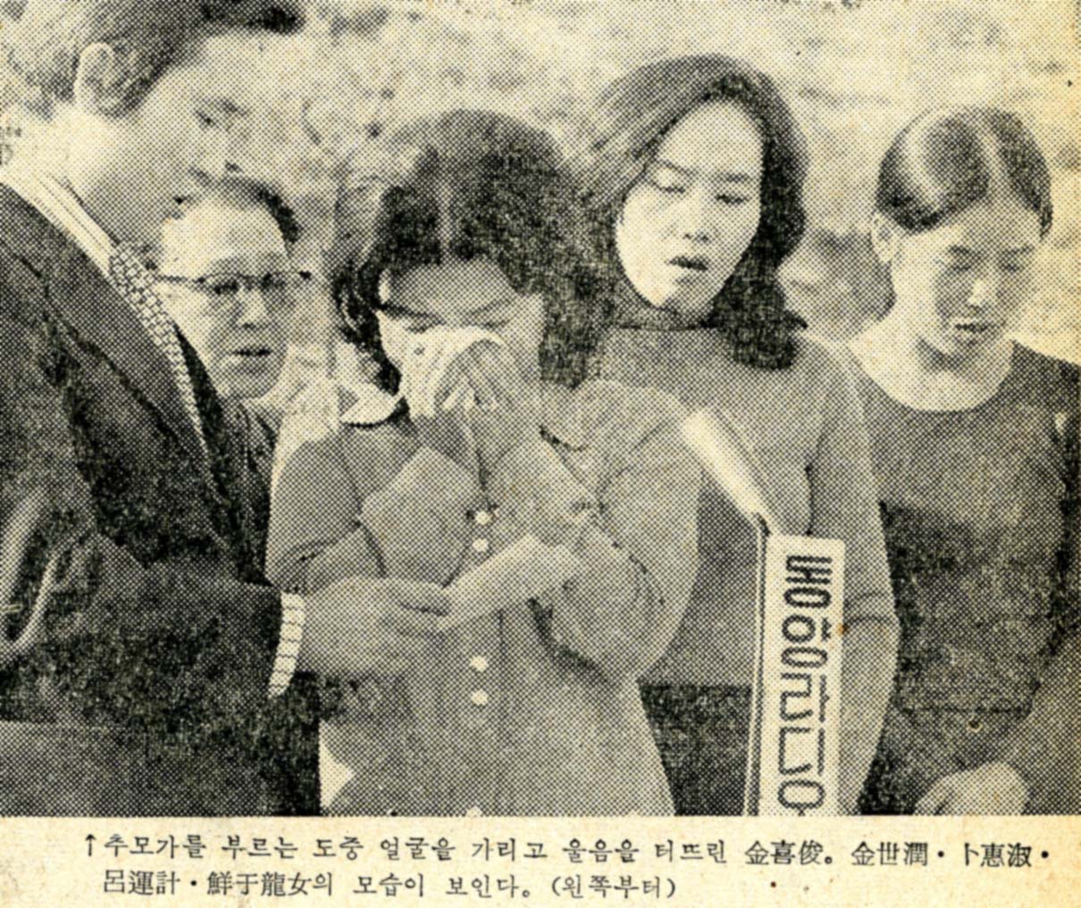 이 자리엔 미망인 조옥순(趙玉順)씨를 비롯한 가족과 『아씨』에 출연했던 김희준, 김세윤(金世潤)등 「탤런트」, 그리고 생전에 고인을 아끼던 동료작가, 연출가들 60여명이 단촐하게 모였다.