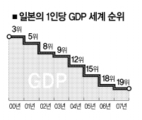 │도쿄 박홍기특파원│일본 국민 스스로 “일본은 부유한 나라라는 말은 옛말에 지나지 않는다.”고 말한다. 단적인 예로 1996년까지 경제협력개발기구(OECD) 30개 회원국 가운데 세계 3위를 지켰던 1인당 국내총생산(GDP)은 2007년 3만 4326달러(약 4150만원)를 기록, 19위로 밀려난 데다 주요7개국(G7) 가운데 최하위라는 까닭에서다.