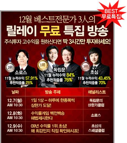 증권방송 하이리치(www.hirich.co.kr)의 베스트 애널리스트로 선정된 3인은 유난히도 주식 하기 어려웠던 올 한해, 남은 기간을 수익으로 마무리하고 2010년 새로 맞이하게 될 강력한 상승장을 준비, 수익 극대화를 도모하기 위해 비밀스러운 특급전략을 공개하겠다고 나섰다.