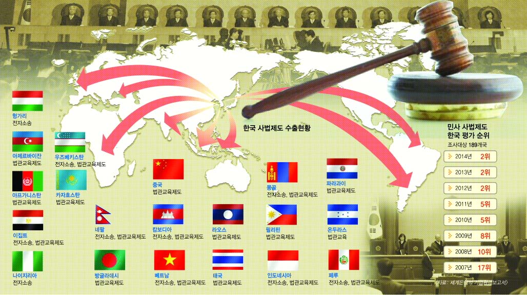 2000년대 접어들면서 비약적으로 발전한 사법부는 과거 원조를 받는 입장에서 이제는 전자소송, 법관교육제도 등 각종 사법제도를 전수하는 입장이 됐다. 대중가요, 드라마 등 문화 콘텐츠뿐 아니라 각종 사법제도가 베트남 등 동남아를 비롯해 남미, 동유럽, 중앙아시아에까지 수출되고 있는 것이다.