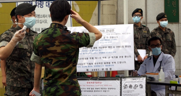 5일 경기도 의정부시 호원예비군 훈련장에 참석한 예비군들이 입소하기 전 정문에서 체온을 측정하고 있다. 2015. 06. 05