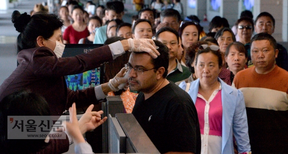 중동호흡기증후군(메르스) 환자가 18명으로 늘어난 1일 인천공항을 통해 입국하는 여객기의 승객이 발열검사대를 통과하고 있다. 2015.6.1 박지환 popocar@seoul.co.kr
