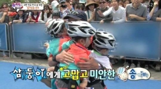 끝내 철인 3종 경기를 완주한 송일국은 “삼둥이에게 고맙고 미안했다. 그래도 꿈을 이뤄서 기분이 좋았다”고 소감을 전했다. 이어 “중간에 민국이가 노래를 불러주는데 울컥하더라. 아빠 욕심이긴 했지만 막상 뛰어보니 아이들에게 미안했다”고 털어놨다.