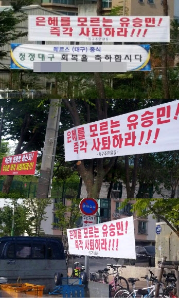 ’동구주민 일동’ 명의의 현수막은 동구 용계동 유승민 원내대표 사무실 인근 도로 및 방촌시장, 각산네거리 등에 주로 설치됐다.