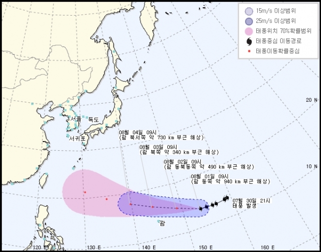 기상청에 따르면 지난 30일 밤 9시 괌 동쪽 약 1670㎞ 부근 해상에서 제13호 태풍 사우델로르가 발생해 북상 중에 있다.