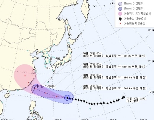 이 태풍은 서북서 방향으로 계속 진출해 8일에는 타이완에 직접적인 영향을 미칠 전망이다. 현재 이 태풍의 강도는 매우 강하며 최대풍속은 50m/s에 이른다. 이 태풍은 타이완을 직접 강타한 후 중국 본토로 진입할 것으로 예측된다.