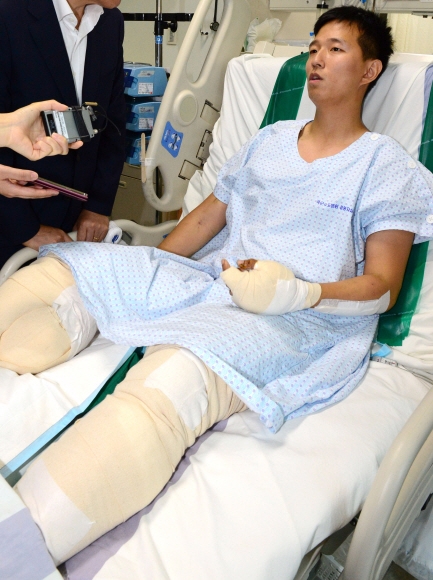 왼쪽 다리도 다친 그는 대수롭지 않은 부상인 듯 “왼쪽 다리는 화상만 입었다”고 말하기도 했다. 이런 김 하사의 모습을 본 문 대표는 “아주 군인답다”, “정신력이 대단하다”며 칭찬을 아끼지 않았다.