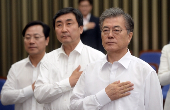 새정치민주연합 지도부가 28일 국회에서 열린 의원 워크숍에서 국기에 대한 경례를 하고 있다. 오른쪽부터 문재인 대표, 이종걸 원내대표, 오영식 최고위원.