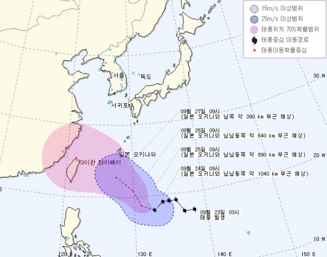 24일 기상청에 따르면 태풍 두쥐안은 전날 오전 3시에 발생했다. 이날 오전 9시 일본 오키나와 남남동쪽 약 1040km 부근 해상을 통과해 시속 28km의 속도로 남서진하고 있다.