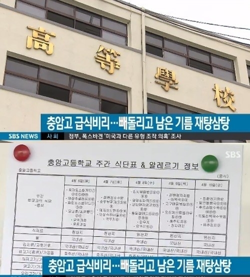 한편, 서울시교육청은 4일 “(학교 당국이) 납품받은 식용유 10통당 약 4통씩은 빼돌리고, 나머지 기름을 여러 차례 재사용하는 방법 등을 써서 2011년부터 최근까지 식재료·식자재비를 최소 1억 5367만원 빼돌렸다”면서 “이 기간에 최소 4억1035만원의 급식 예산을 횡령한 의혹이 있어 충암고 전 교장과 충암학원 전 이사장 등 18명을 검찰에 고발했다”고 밝혔다.