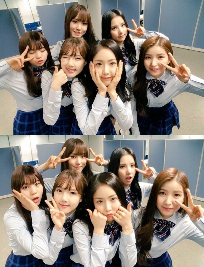 이 사진에는 여자친구 멤버들이 귀여운 교복 의상을 입고 깜찍한 포즈를 취하고 있다.