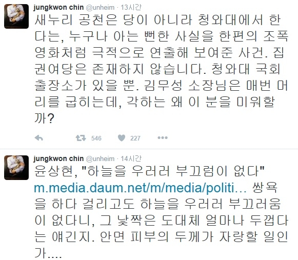 진 교수는 이어 “새누리당 공천은 당이 아니라 청와대가 한다는, 누구나 아는 뻔한 사실을 한 편의 조폭영화처럼 극적으로 연출해 보여준 사건”이라면서 “집권 여당은 존재하지 않습니다. 청와대 국회출장소가 있을 뿐. 김무성 소장님은 매번 머리를 굽히는데 각하는 왜 이 분을 미워할까?”라고 반문했다.