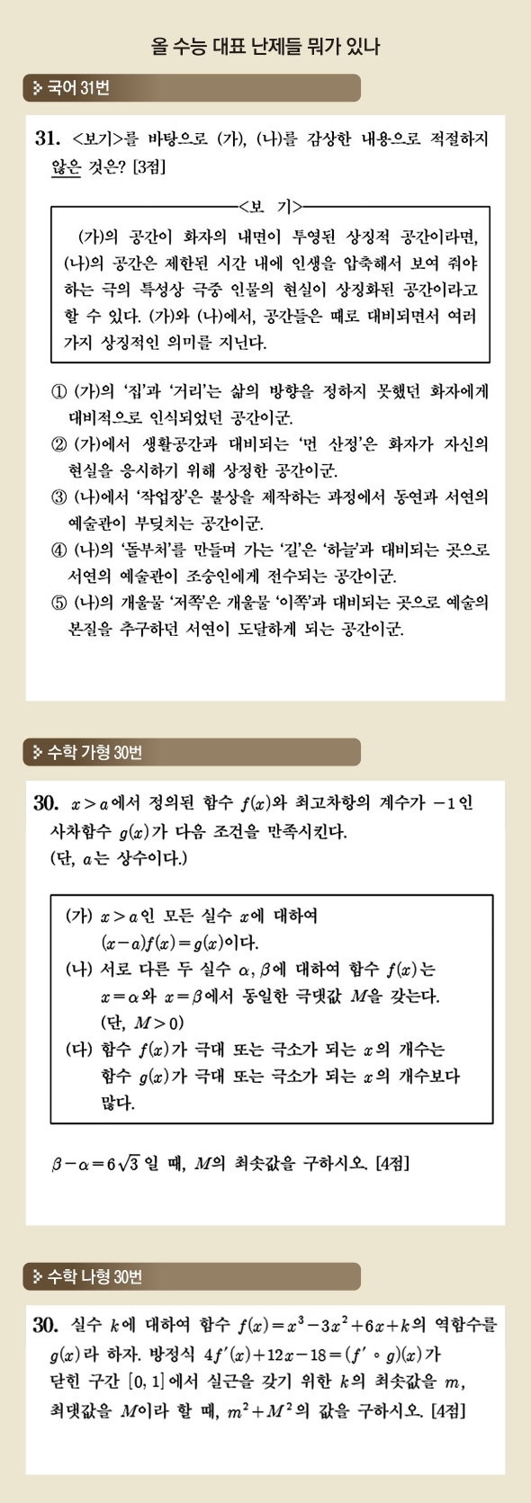 수학 영역에서는 신유형에 난도까지 높은 문제도 등장해 학생들이 적잖이 당황했을 것으로 보인다. 가형에서는 주어진 곡선과 X축 사이의 넓이를 이해해야 하는 20번 문제와 주어진 조건에서 부분적분법을 활용하는 21번 문제, 공간도형 벡터 문제인 29번 문제가 고난도로 꼽힌다. 특히 미분법을 활용해 곡선의 개형을 파악하고 문제를 해결할 수 있는지를 묻는 30번 문제는 신유형이라 최고난도로 꼽기에 손색없을 정도다. 조만기 판곡교 교사는 “어디서 많이 본 듯한 문제로 접근했겠지만, 답변을 구하는 과정에서 모든 조건의 개념을 알아야 답을 할 수 있기에 어려웠을 것”이라고 말했다.