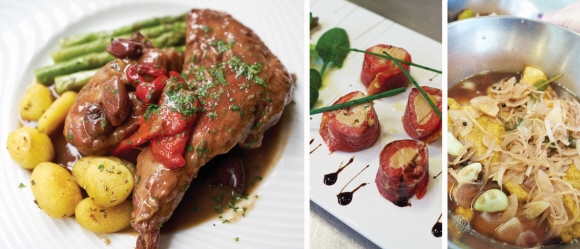 와인에 식초를 넣은 토끼 다리 요리. 오래 익히는 고기에 식초를 쓰면 산미는 휘발되고 감칠맛만 남는다(사진 왼쪽). 발사믹 식초를 곁들인 피망과 참치 요리. 발사믹 식초는 주로 졸여서 음식에 포인트를 주는 용도로 쓴다(가운데). 이탈리아의 카르피오네. 식초와 와인, 물을 끓여 고기 등을 재워 먹는 초절임 요리다(오른쪽).