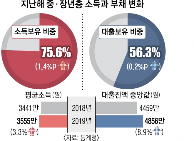 22일 통계청의 ‘2019년 중장년층 행정통계 결과’를 보면 지난해 중장년층 1인당 평균 근로소득과 사업소득은 1년 전보다 3.3% 증가한 3555만원으로 집계됐다. 금융권 대출잔액(중앙값·크기 순서로 줄 세웠을 때 중앙에 위치한 값)은 8.9% 늘어난 4856만원으로 나타났다. 빚 증가율이 소득 증가율보다 높다는 건 삶이 그만큼 팍팍했다는 것이다. 주택을 소유한 비중은 42.6%로 나타났다. 나머지 57.4%는 무주택이란 이야기다. 유주택자 대출잔액은 9260만원으로 무주택자(2400만원)보다 3.9배나 많았다.