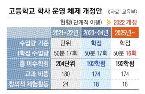 수업·학사운영 기준이 ‘단위’에서 ‘학점’으로 변경된다. 현재 고등학교를 졸업하려면 모두 204단위 수업을 끝마쳐야 하지만 2025년부터는 12단위·학점이 줄어든 192학점만 이수하면 된다. 이에 따라 공통과목인 국어·수학·영어·사회는 각각 10단위에서 8학점으로 2시간씩 줄었다. 2025년부터는 고교 3년간 국·영·수 수업 시간이 총 105시간 감소하는 셈이다.