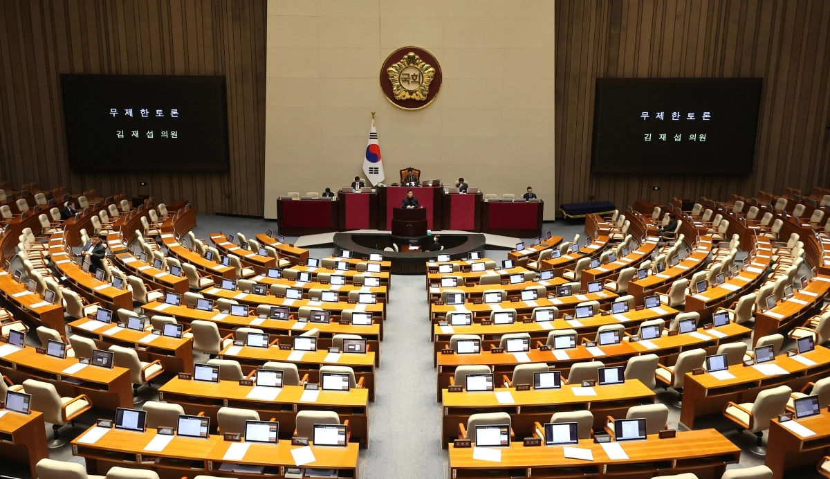 김재섭 국민의힘 의원이 20일 새벽 국회에서 열린 3월 임시국회 2차 본회의에서 공소청법(대안)에 관한 무제한 토론(필리버스터)을 하고 있다. 연합뉴스